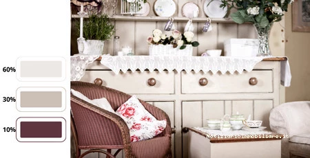 Ora che abbiamo esplorato i colori principali dello stile Shabby Chic, vediamo come possono essere abbinati per creare un ambiente armonioso e accogliente. L’importanza di progettare fin dall’inizio l’ambiente ti permetterà di acquistare tutto ciò che ti occorre. Nell’arredamento della stanza, quando si scelgono i colori, è importante seguire la regola del 60-30-10. Questa regola prevede che nella stanza sia presente il 60% colore principale + 30% colore secondario + 10% colore d’accento; quindi il primo colore dovrà essere quello predominante ( solitamente nello shabby chic si tratta di un tono neutro come il bianco o il grigio) un colore secondario e infine un colore d’accento che solitamente è quello più acceso e vivace che sarà presente in percentuale minima.