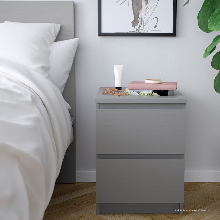 - MALM: Icona del design minimalista, il comodino IKEA MALM è perfetto per chi ama le linee pulite e contemporanee. Disponibile in diverse finiture (bianco, nero-marrone, rovere), misura 40 cm di larghezza, 55 cm di altezza e 48 cm di profondità. Dotato di un cassetto spazioso con chiusura ammortizzata, costa 45€. È ideale per camere moderne e si integra facilmente con letti della stessa serie, creando un effetto coordinato che valorizza l’ambiente.